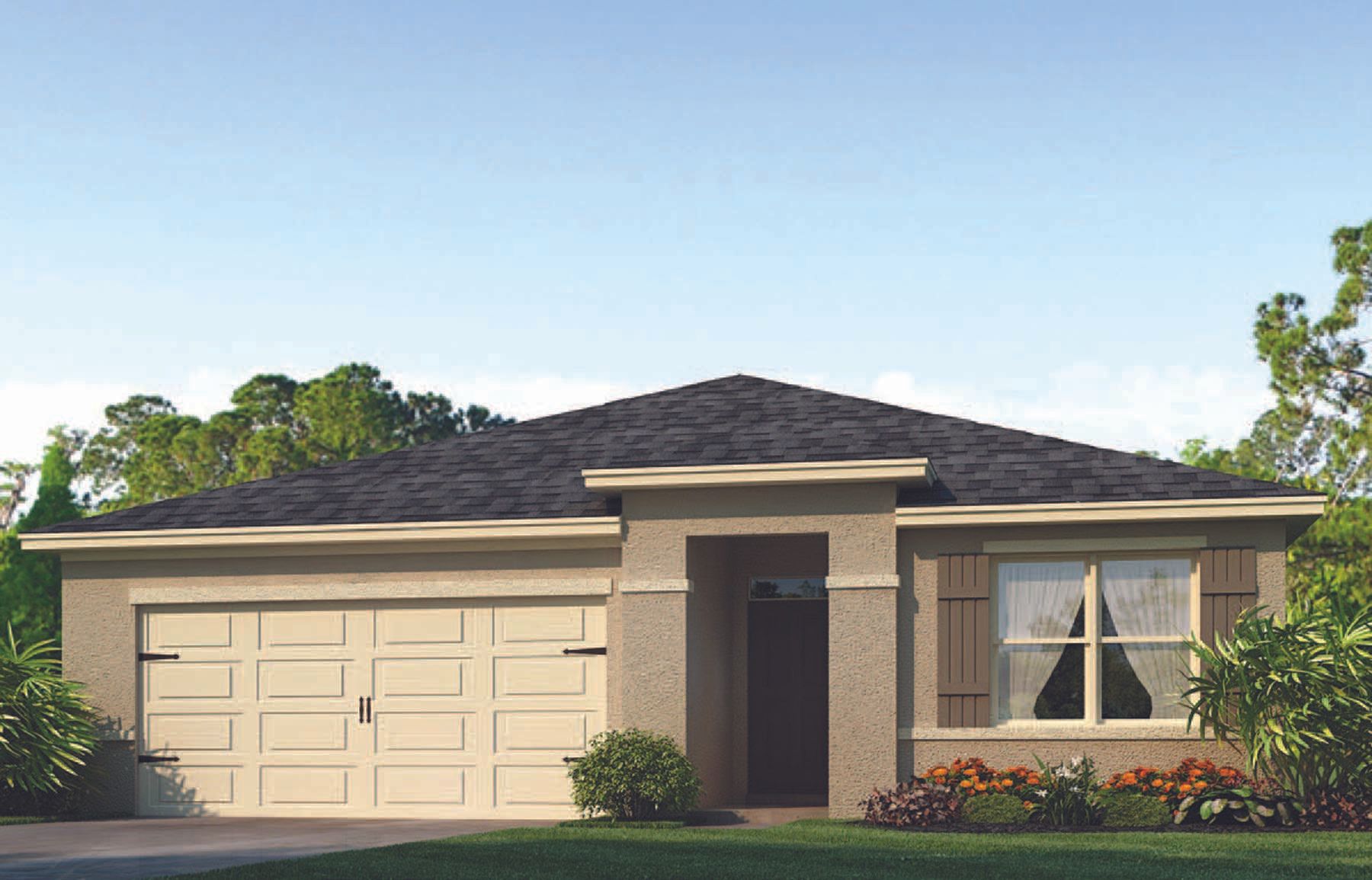 Bradburry presenta el Aria, disponible para construir en Haines City, Florida. Este diseño de un piso construido completamente con bloques de concreto optimiza el espacio habitable con una cocina de concepto abierto con vista a la sala de estar, el comedor y la terraza cubierta. El entretenimiento es muy sencillo, ya que esta popular casa unifamiliar cuenta con una cocina espaciosa que incluye cocina comedor, un área de comedor hacia el frente de la casa y una despensa espaciosa para almacenamiento adicional. Este complejo cuenta con electrodomésticos de acero inoxidable renovados, lo que hace que cocinar sea pan comido. El primer dormitorio, ubicado en la parte trasera de la casa para mayor privacidad, tiene un baño privado que cuenta con un lavabo doble con ducha a ras de suelo. Dos dormitorios adicionales comparten un segundo baño. Esta casa también cuenta con un agradable espacio de lavandería con puertas privadas. Como todas las casas en Bradburry, Aria incluye un paquete de tecnología de hogar inteligente Home is Connected que le permite controlar su hogar con su dispositivo inteligente mientras está cerca o lejos.